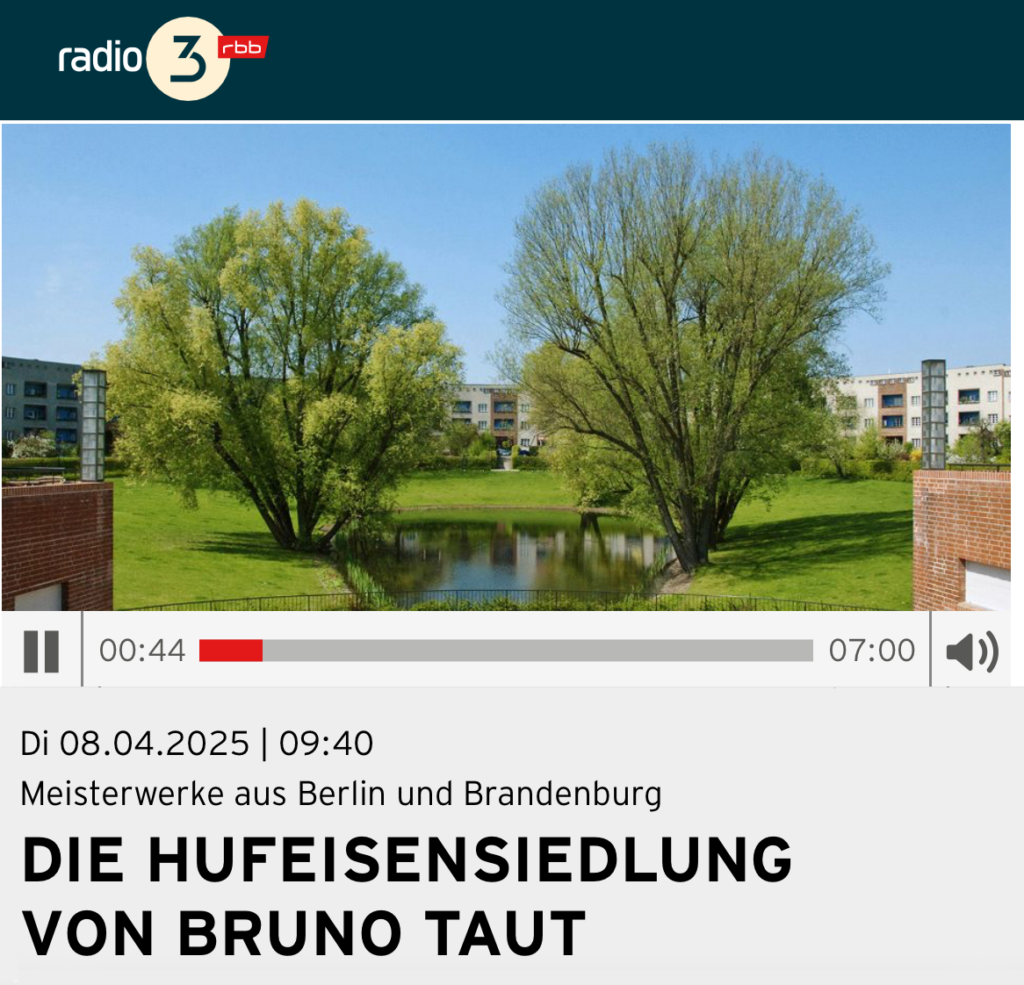 Sowie bei rbb Kultur in der Reihe Meisterwerke aus Berlin und Brandenburg: Feature Die Hufeisensiedlung von Bruno Taut, Beitrag von Thorsten Föste, Erstausstrahlung 8.4.2025