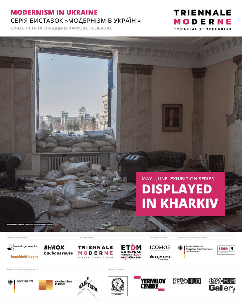 Die in Kooperation mit dem vor Ort ansässigen YermilovCentre gezeigte Ausstellungsteile 3, 4 und 6 bestehen aus rund 120 der insgesamt 283 Tafeln umfassenden Serie, die zur Triennale der Moderne 2022 in Berlin erstellt und erstmalig gezeigt wurde. Die Foto- und Text-Tafeln zeigen herausragende Gebäude der Moderne in Charkiw und Lviv, erläutern diese und stellen sie in einen Kontext eines gemeinsamen europäisches Erbes der Moderne. Deren Werte und ihre baulichen Zeugen gilt es angesichts der Zerstörungen und anti-modernen Bestrebungen – zu retten, zu kommunizieren und gemeinsam Wege einer geeigneten Instandsetzung auszuloten.